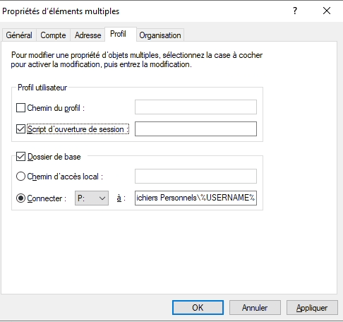 Maintenant, nous allons aller dans nos utilisateurs Escrime et ajouter le Script d’ouverture de session comme ceci :