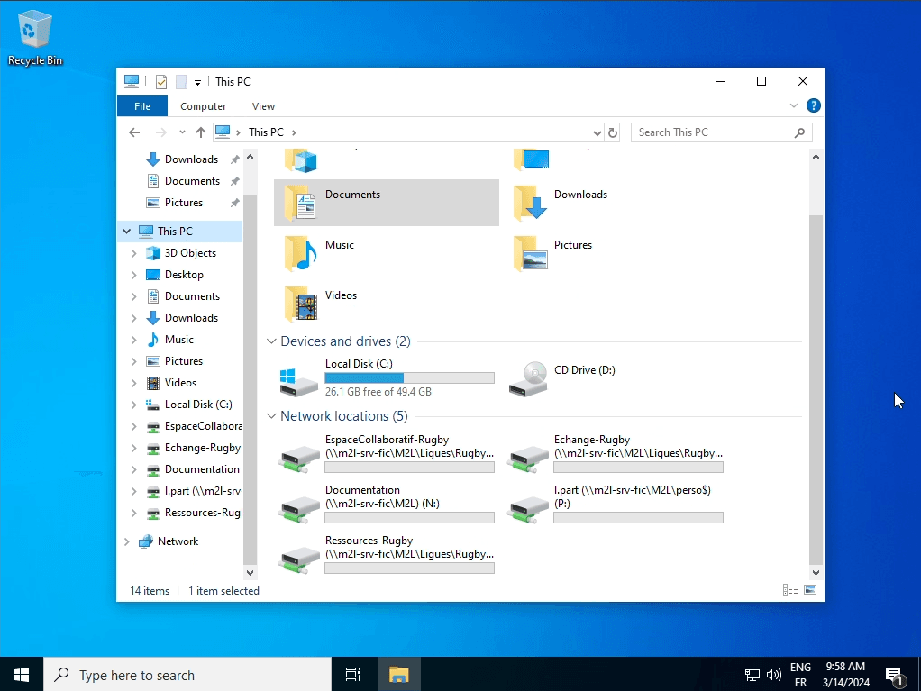 Les membres des ligues doivent avoir accès à 5 lecteurs réseau : leur dossier personnel, Echange-nomligue, EspaceCollaboratif-nomligue, Ressource-nomligue et Documentation (accessible aux personnels de la M2L), pour faciliter le partage et la collaboration.
