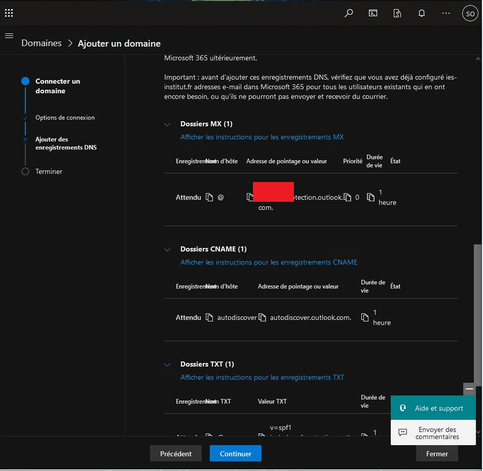 • Un enregistrement CNAME pour acheminer le courrier vers les serveurs Microsoft.