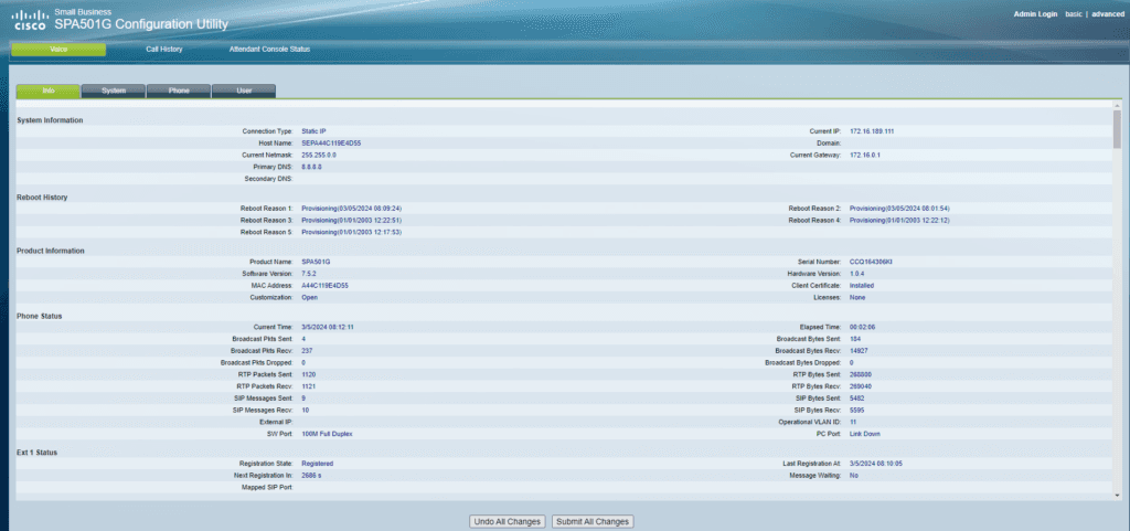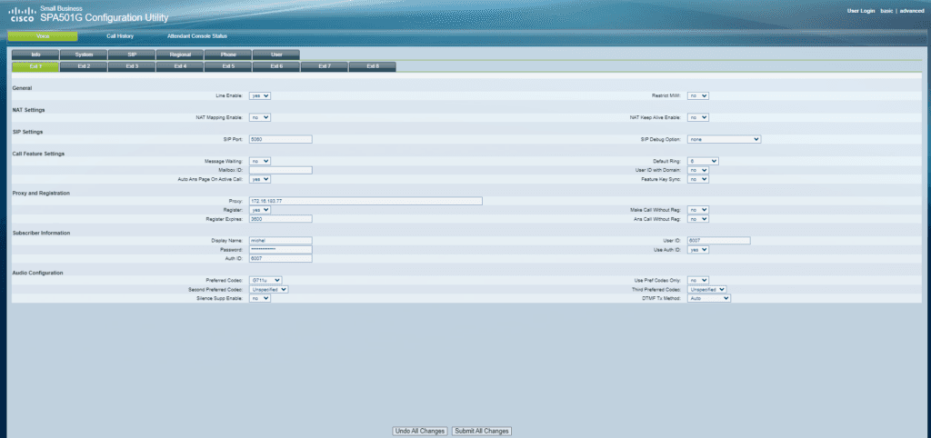 Enfin, dans l’onglet « Ext1 », j’ai déclaré le numéro de la ligne, l’utilisateur et l’adresse IP du serveur de téléphonie. J’ai entré l’adresse IP du serveur de téléphonie suivie de ‘:’ et du port d’écoute (5060 dans mon cas) dans le proxy. Dans « Informations d’abonné », j’ai renseigné l’utilisateur, le numéro de la ligne et le mot de passe associé. Pour sauvegarder ces modifications, j’ai cliqué sur « Submit All Changes ».