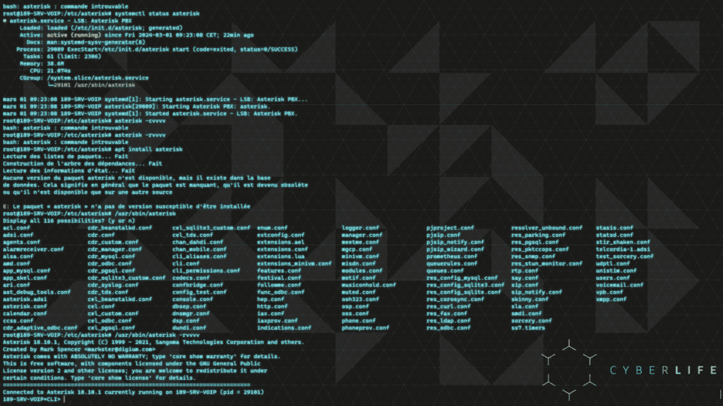 Enfin, j’ai démarré Asterisk en utilisant la commande etc/init.d/asterisk start.