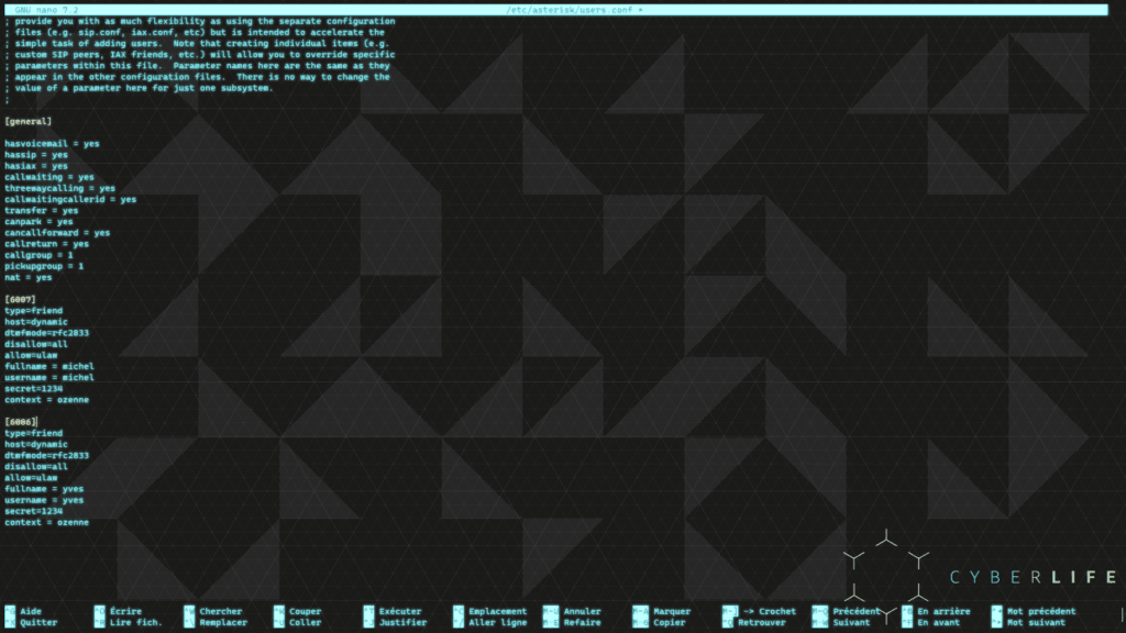 Dans la console Asterisk, j’ai configuré deux utilisateurs SIP en tapant les informations suivantes dans le fichier extensions.conf :