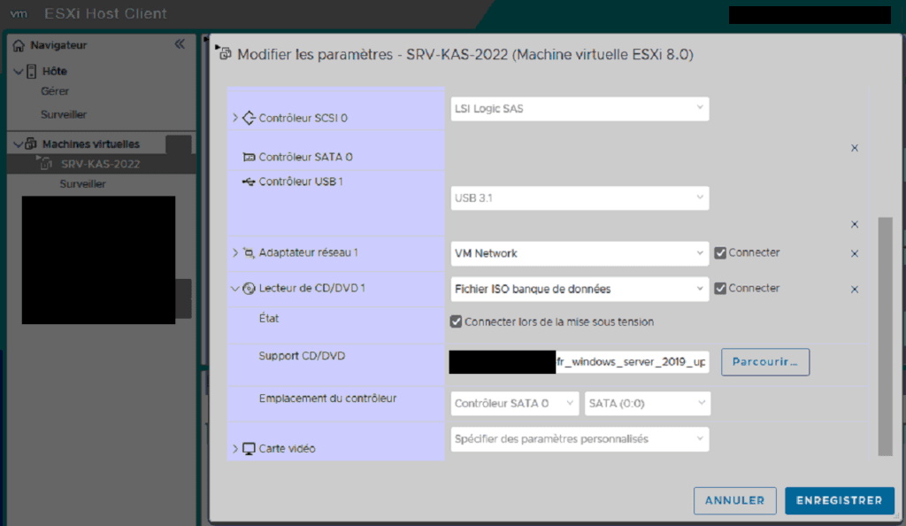 Tout d’abord, j’ai commencé par monter l’ISO de Windows Server dans la VM, de cette façon, j’avais une console