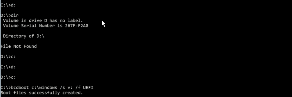 bcdboot d:\Windows /s v: /F UEFI (d: étant le dossier d'installation Windows)