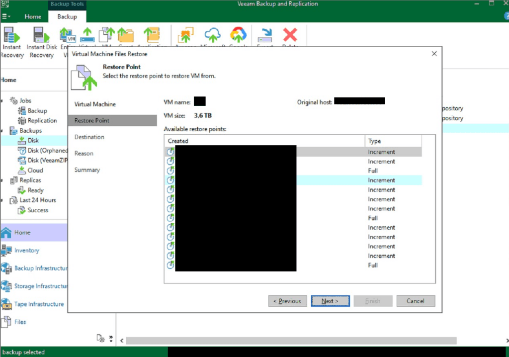 Choix de la machine virtuelle et du point de sauvegarde Nous devons ensuite choisir la machine virtuelle à partir de laquelle nous allons restaurer le fichier. Je sélectionne la sauvegarde incrémentielle la plus récente.