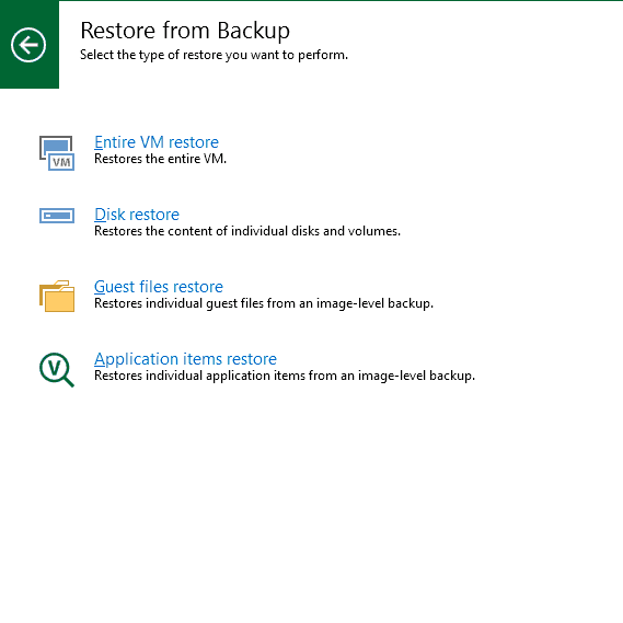 Sélection de l’option de restauration Après avoir sélectionné cette option, un assistant de restauration s’affiche. Celui-ci propose de restaurer soit la machine virtuelle entière, soit un disque, soit des fichiers invités. Dans notre cas, nous voulons restaurer un seul fichier dans une machine virtuelle, nous sélectionnons donc « Restauration de fichiers invités ».